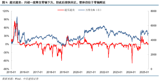 超买超卖:该指标以短期视角刻画市场强弱情况,4月初在关税冲击下曾短暂降至零轴下方,目前接近零轴,显示市场短期超涨超跌情况并不明显。