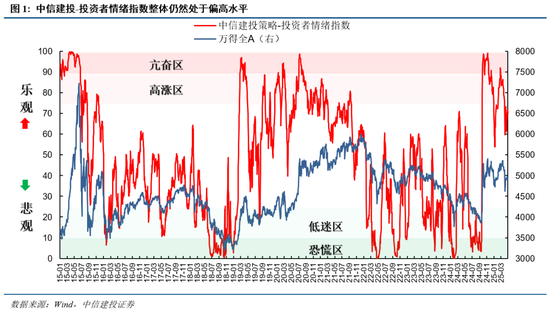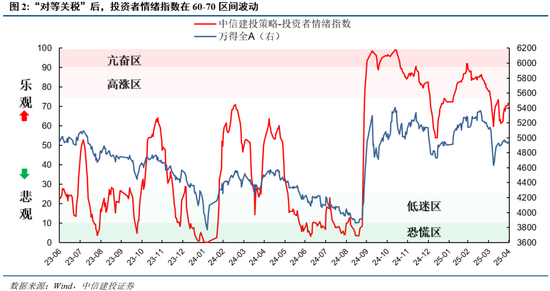 在市场情绪跟踪3月报中,我们指出3月14日情绪指数就已经发出左侧预警信号,21日发出右侧卖出信号,回顾历史阶段性的震荡整固最终无碍牛市行情的延续。4月清明前后,全A指数和市场情绪都遭到了特朗普“对等关税”的巨大冲击,但在中央汇金的流动性支持下,市场情绪很快回暖,情绪指数在60-70之间波动,市场也重回震荡格局。