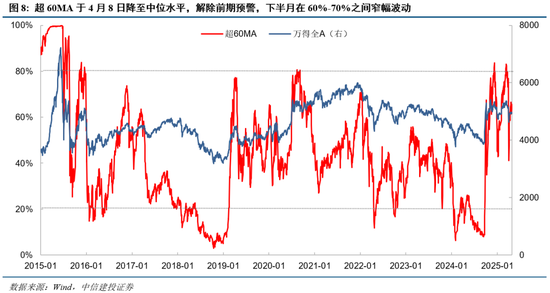 超60MA:该指标3月14突破80%预警线,提示阶段调整风险。该预警于4月8日解除,此后该指标处于60%-70%区间,显示中长期视角下市场整体仍偏强势。
