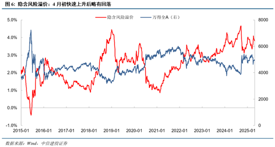 隐含风险溢价:由于权益市场大跌和国债收益率回落影响,4月初隐含风险溢价快速上升,不过随着A股企稳回升,指标在下半月略有回落,总体看权益性价比仍然偏高。