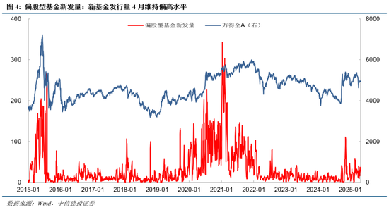 偏股型基金新发量:新基金发行量4月维持偏高水平。2月下旬以来新基金发行回暖后,3-4月继续维持高位,不过结构上依然以被动指数基金为主,主动型基金占比很小。