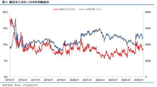融资买入占比:4月中位窄幅波动。该指标4月依然处于去年10月以来偏低位置,基本位于8.2-8.7%之间窄幅波动,这反映了杠杆资金的观望情绪,目前尚未出现明显的看涨或看跌信号。