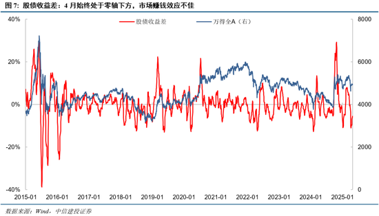 股债收益差:4月始终处于零轴下方,市场赚钱效应不佳。反映投资者短期赚钱效应的股债收益差指标3月末已经降至零轴下方,4月受关税冲击大幅下滑至约-11%的低位,随后虽有改善但仍始终处于零轴下方。
